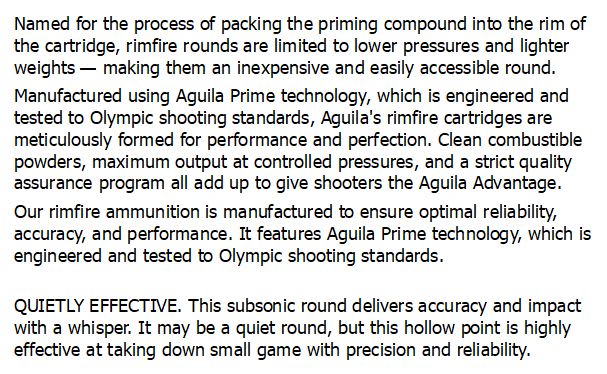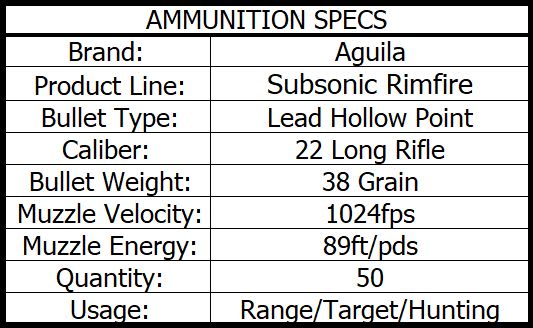 AGUILA 22LR SUBSONIC 38gr HOLLOW POINT 1024fps 50pk quantity