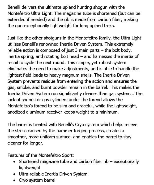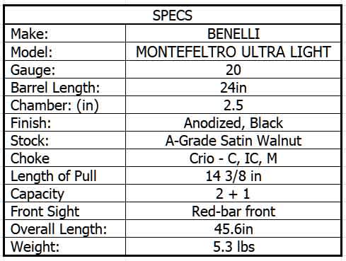 BENELLI MONTEFELTRO ULTRA LIGHT 20ga SATIN WALNUT 24in 2rnd
