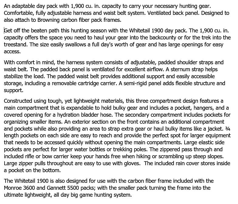 BROWNING WHITETAIL 1900 MAJOR BROWN HUNTING PACK