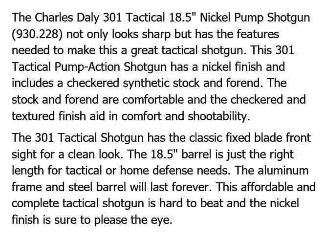 CHARLES DALY 301 12ga 3inTACTICAL NICKEL 18.5in 4rnd quantity