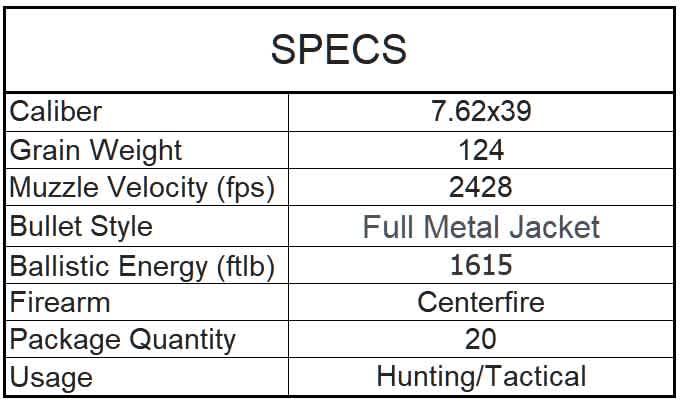 MFS RUAG 7.62X39mm 124gr FMJ 2428fps 20pk quantity
