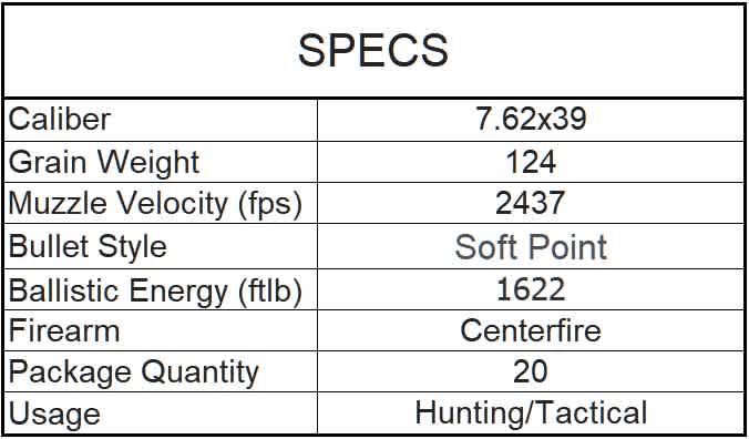 S&B 7.62X39mm 124gr SP 2437fps 20pk quantity
