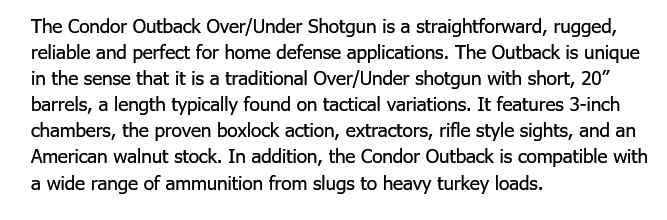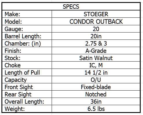 STOEGER 20ga CONDOR OUTBACK 2.75in OVER/UNDER 28in 2rnd